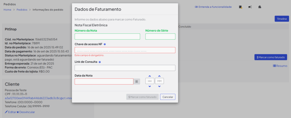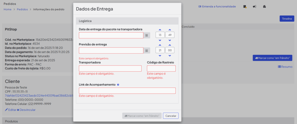 Para avançar de status para Enviado, os seguintes dados precisam ser informados: