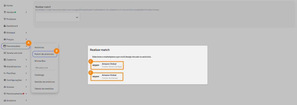 O processo de realizar o match de produtos inicia-se ao acessando:  A Transmissões >> B Match de aúncios. Feito isso, o primeiro passo é selecionar o marketplace no qual deseja vincular seus produtos. Após abrir o menu de seleção, basta clicar sobre o nome do marketplace desejado para prosseguir.