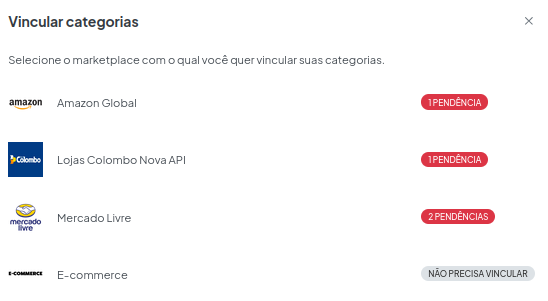 Após clicar em “Vincular categorias” aparecerá a listagem de marketplaces que você possui ativos dentro do seu painel ANYMARKET. Clique no marketplace que deseja realizar o vínculo da categoria: