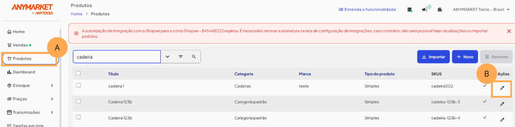 Você deve ir no cadastro do produto dentro do ANYMARKET, clicar em editar seu produto: