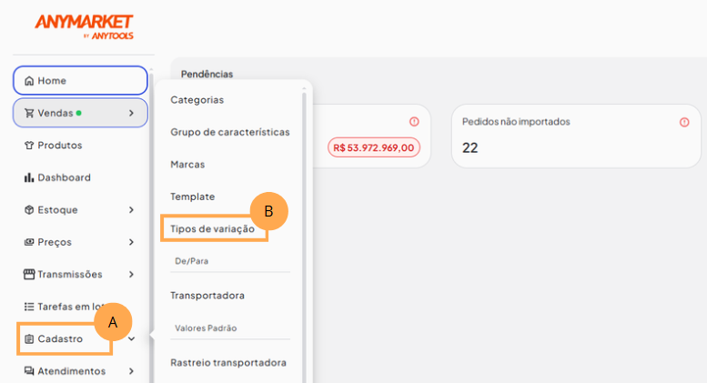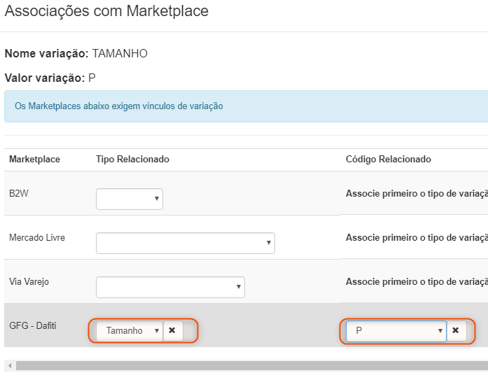 Para realizar o vínculo das variações cadastradas no ANYMARKET, com as variações disponíveis na Dafiti é necessário acessar a tela: