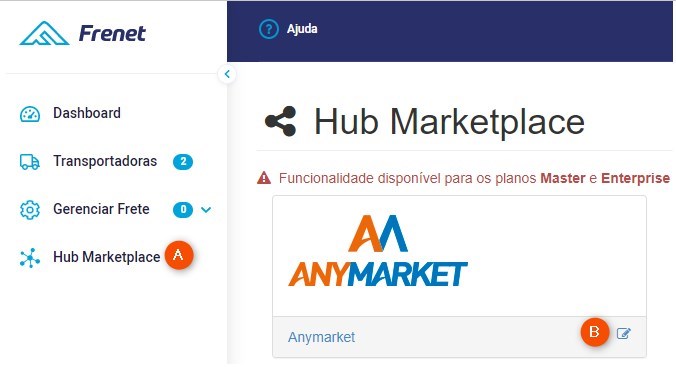 No menu da esquerda, clique em A > “Hub Marketplace” e depois clique em B > Editar, no módulo ANYMARKET: