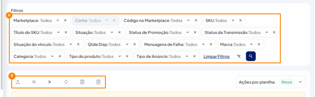 Na pesquisa avançada é fornecida diversas opções para que possa filtrar seus produtos, por: Marketplace; Conta; Código no Marketplace; SKU; Título do SKU; Situação; Status de Promoção; Status de Transmissão; Situação do vínculo; Quantidade Disponível; Mensagem de Falha; Marca; Categoria; Tipo do produto; Tipo de Anúncio.