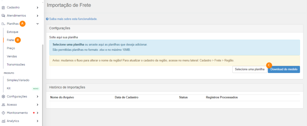 Para cadastrar a tabela de frete no ANYMARKET é necessário que acesse a tela: A Planilhas >> B Frete >> C Clicar no botão “Download do modelo”.