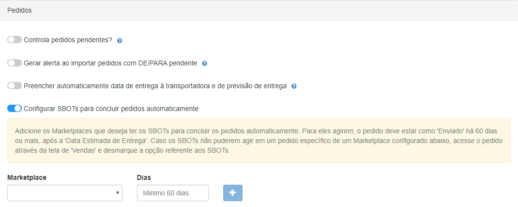 D – Configurar SBOTS para concluir pedidos automaticamente: opcional. Caso seja habilitado irá abrir os campos E e F, onde o cliente define o marketplace e quantos dias após o pedido marcado como ENVIADO, os SBOTs irão atualizar o pedido automaticamente para Concluído. Fazendo essa definição, clicar no sinal de ‘mais’ do lado. Essa configuração pode ser feita para diversos marketplaces, desde que estão ativos no ANYMARKET.