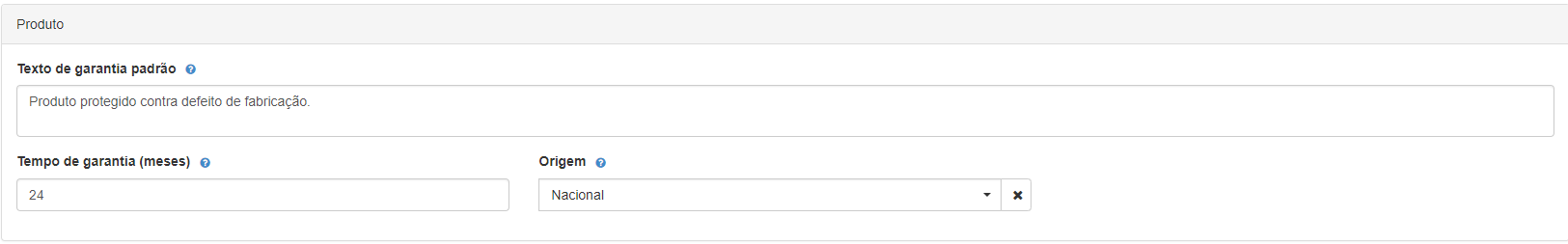 Tempo de garantia (meses): deve ser preenchido somente o número de meses padrão que irá preencher o “Tempo de garantia (meses)” sempre que um novo produto for cadastrado.