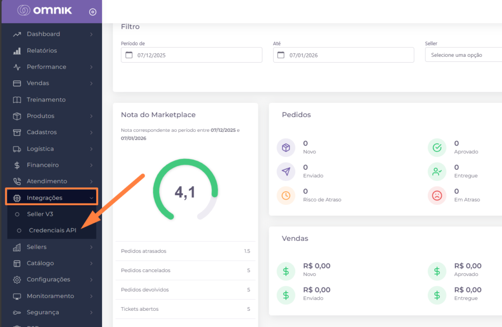 É possível coletar os dados de integração direto no painel do vendedor OMNIK. A informação que precisamos para ativar a integração é o token e tenant, e pode ser coletado no seguinte menu: