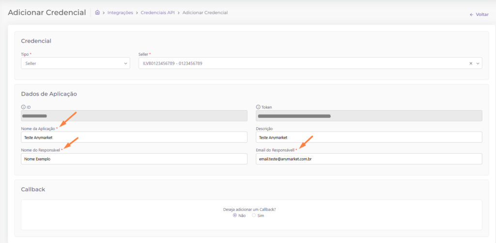 E realizar o preenchimento das informações obrigatórias (Nome da Aplicação; Nome do Responsável; Email do Responsável):
