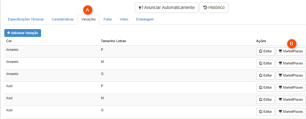 Produto com variação: Em produtos com variação é necessário editar o produto e ir a aba A “Variações” e na sequência clicar em B marketplaces: