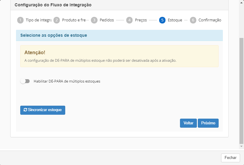 Acessando configurações de estoque, terá a possibilidade de configurar Múltiplos CDs de estoque caso utilize esse modelo de trabalho, ativando a flag abaixo serão exibidos os estoques cadastrados na VTEX, e caso opte por esse ponto, deverá cadastrar novos estoque no ANYMARKET para que possa referenciar.