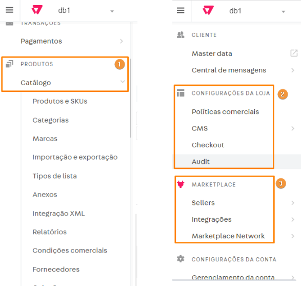 Para identificar qual é a sua conta principal, basta verificar ao lado do menu em seu painel VTEX. Na conta principal é possível cadastrar produtos (1), definir políticas comerciais (2) e configurar os demais sellers (3):
