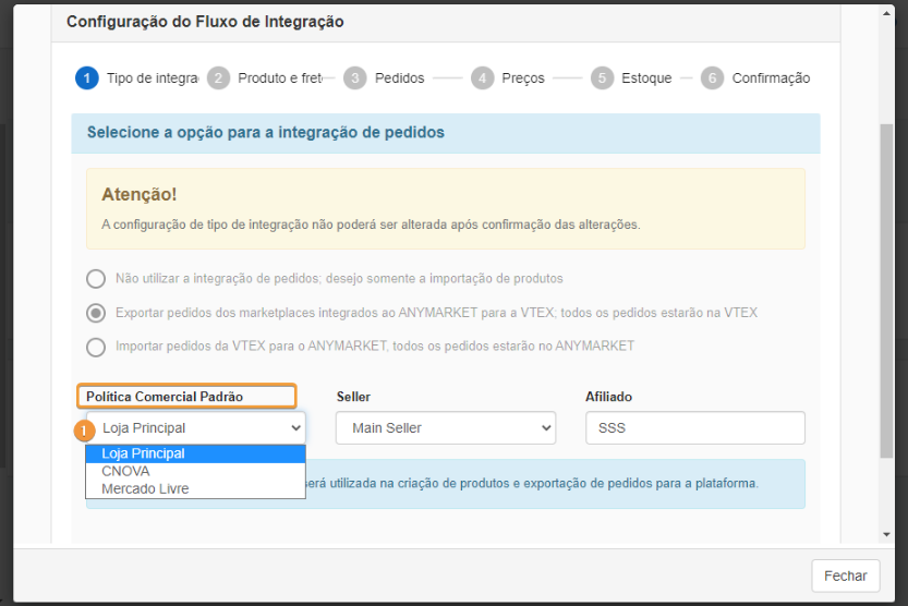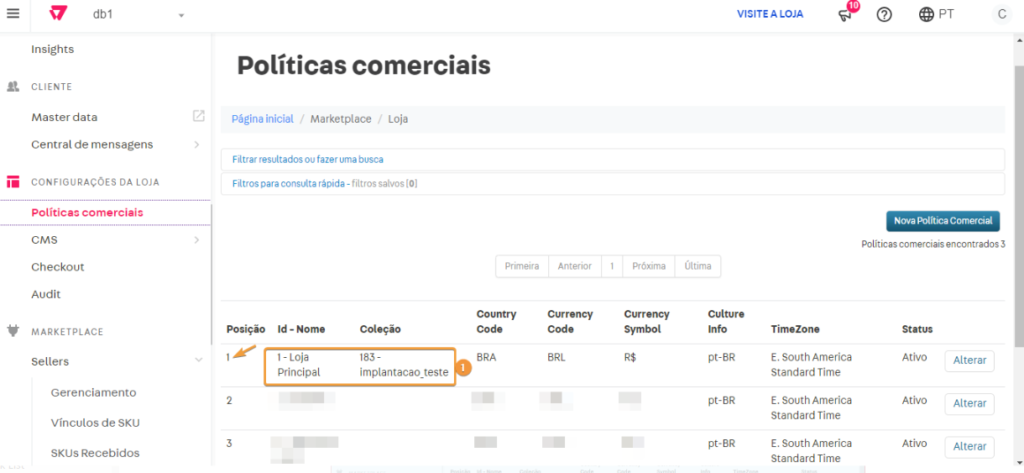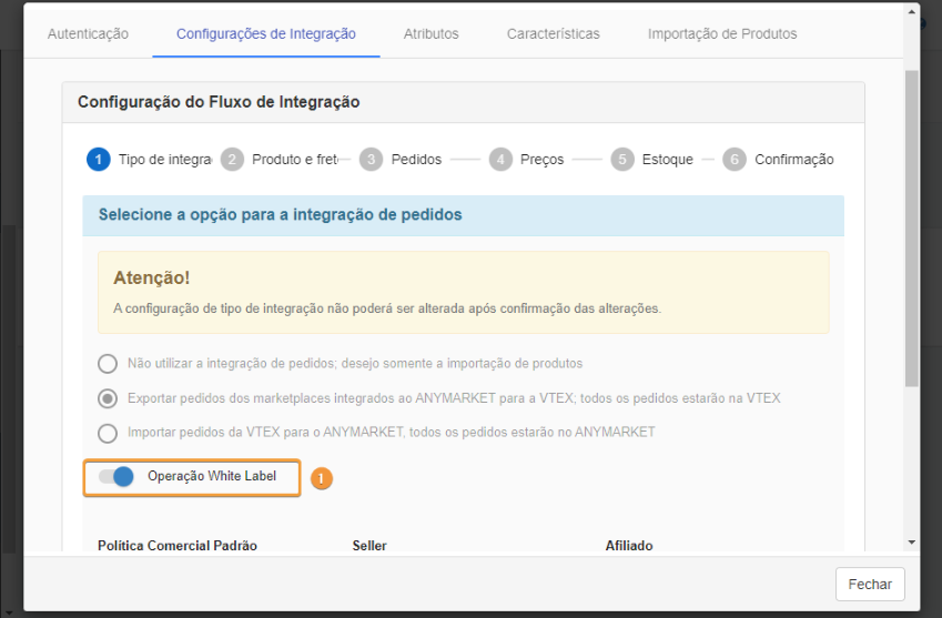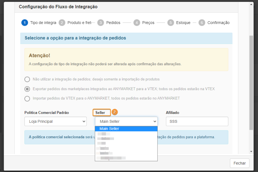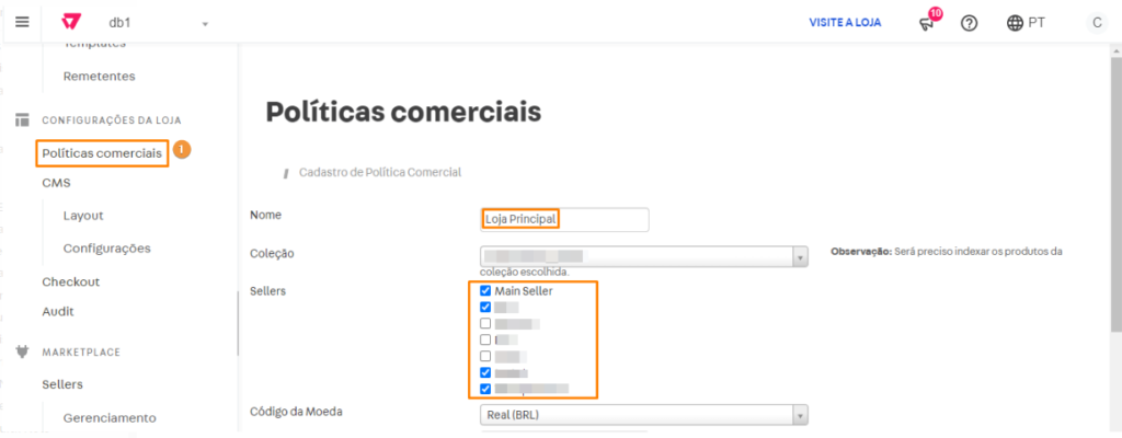 Ao listar as políticas comerciais, você deve selecionar aquela que abranja todos os sellers white label que você deseja integrar no ANY. Para conferir se a política comercial está correta, acesse no painel VTEX o caminho Configurações da loja > Políticas comerciais, ao selecionar a política podemos ver para quais sellers ela atende.