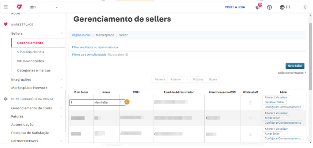 Nesse momento, o “Seller” selecionado deve ser o principal da conta VTEX. Em Sellers > Gerenciamento, verifique que o seller (1) inserido na tela do ANY seja o de identificador “1”: