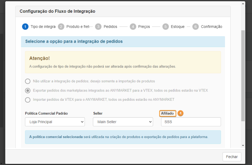 O afiliado padrão selecionado (1) deve estar vinculado a politica comercial (2) da conta principal, e precisa ter o endpoint (3) corretamente configurado: