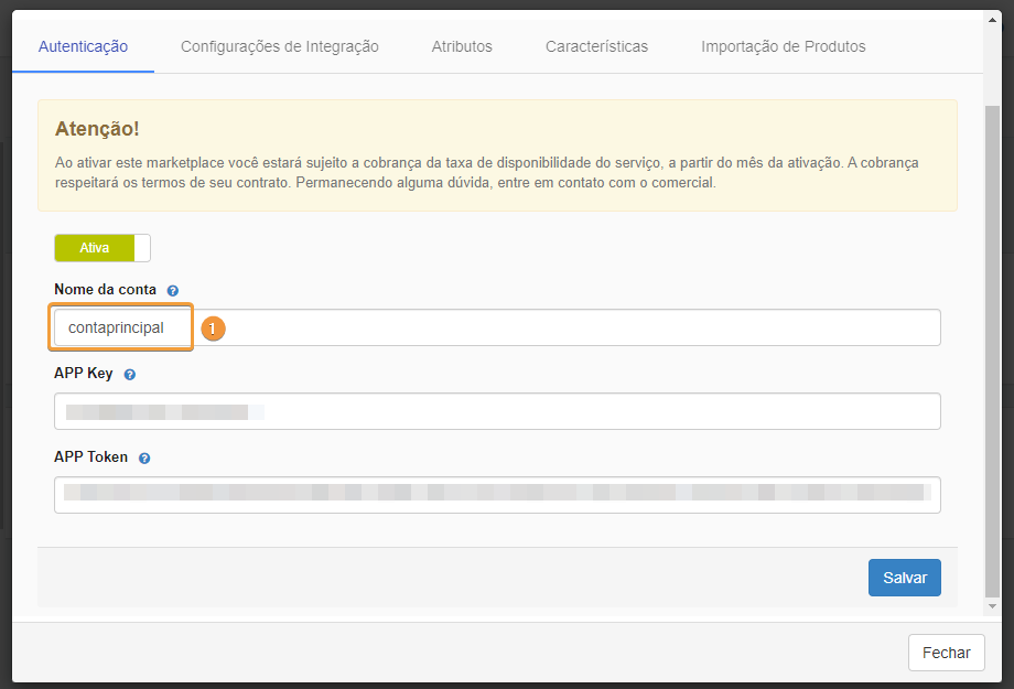 Ao informar o “Nome da conta” (1), deve-se levar em consideração A CONTA PRINCIPAL, a matriz onde está o seu catálogo de produtos cadastrados na VTEX.