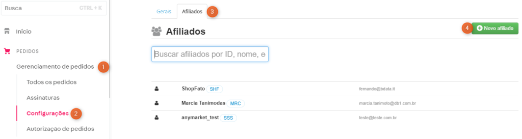 3. Clicando na aba Afiliados, ira encontrar os afiliados já cadastrados que contemplam outras integrações, é importante que seja criado um novo afiliado para a conexão com o ANYMARKET.