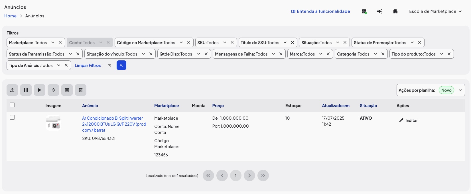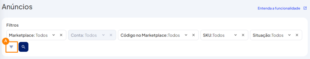 Na pesquisa avançada é fornecida diversas opções para que possa filtrar seus produtos, por: Marketplace; Conta; Código no Marketplace; SKU; Título do SKU; Situação; Status de Promoção; Status de Transmissão; Situação do vínculo; Quantidade Disponível; Mensagem de Falha; Marca; Categoria; Tipo do produto; Tipo de Anúncio.