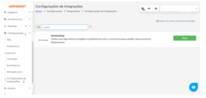 Na lista de integrações do ANYMARKET, vá em “Configurações (1) > Configurações de Integrações> e então busque por “Nuvemshop (3)”: