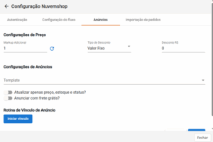 Após autenticar sua conta Nuvemshop, as demais configurações do módulo serão apresentadas: